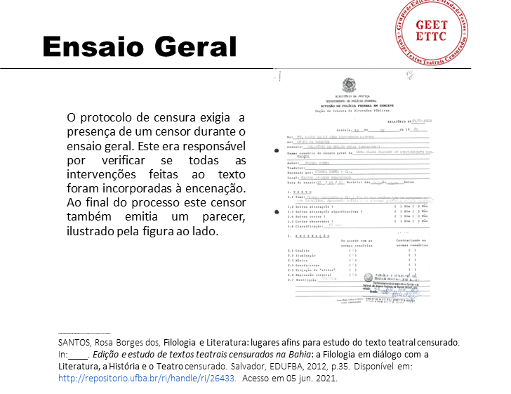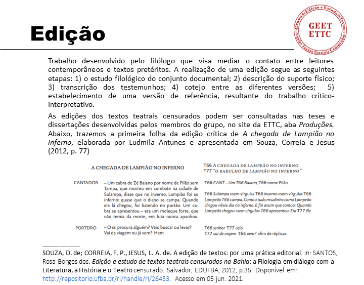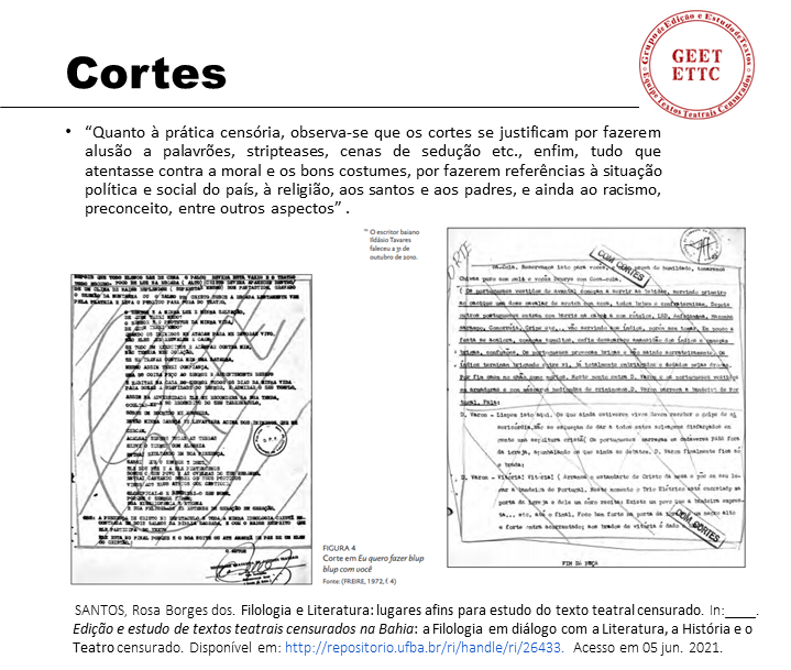 A partir de 2006, formou-se a Equipe Textos Teatrais Censurados (ETTC). Os textos teatrais censurados no período da ditadura militar na Bahia passam a objeto de edição e estudo no campo da Filologia Textual.